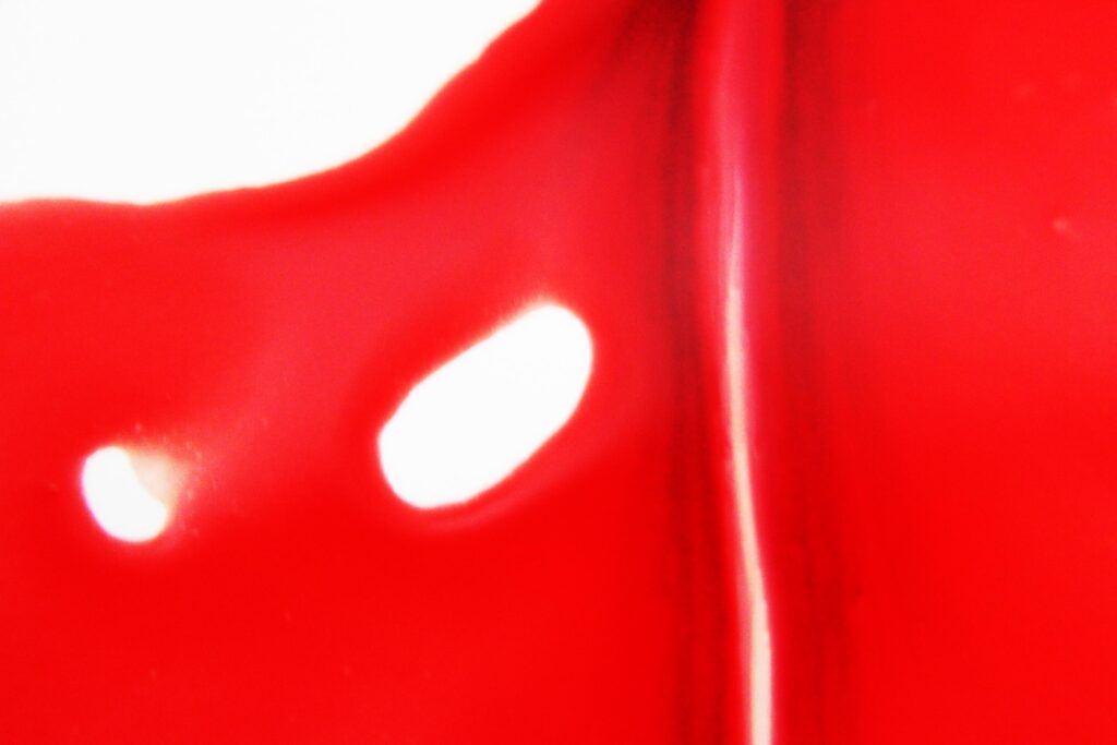 Objetos cotidianos são usados como instrumentos para a realização do fazer artístico e do questionamento do gesto social: coletar o sangue e não o descartar.